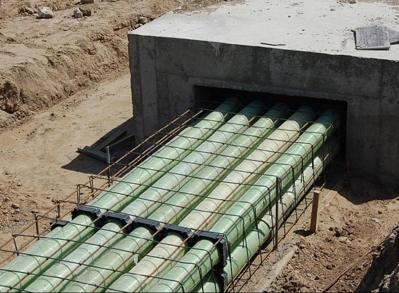 8、施工安裝快捷方便:玻璃鋼電纜保護管重量只有鋼管的1/4,混凝土管的1/10左右,運輸及敷設(shè)施工簡捷方便。玻璃鋼電纜保護管安裝主要采用“O”型密封圈承插連接方式,連接接頭處密封采用橡膠密封圈,適應(yīng)熱脹冷縮,又可防止泥沙進入,特殊位置也可采用法蘭或粘接等連接方式